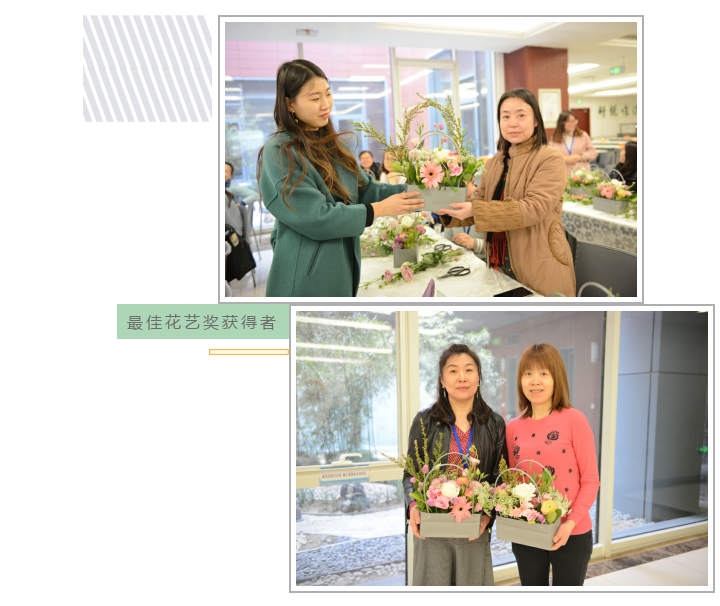 一個個作品新鮮出爐后,花藝老師逐一對大家的作品進行點評和指導(dǎo),根據(jù)作品的創(chuàng)新性與精美行,評選出三個“最佳花藝”獎。