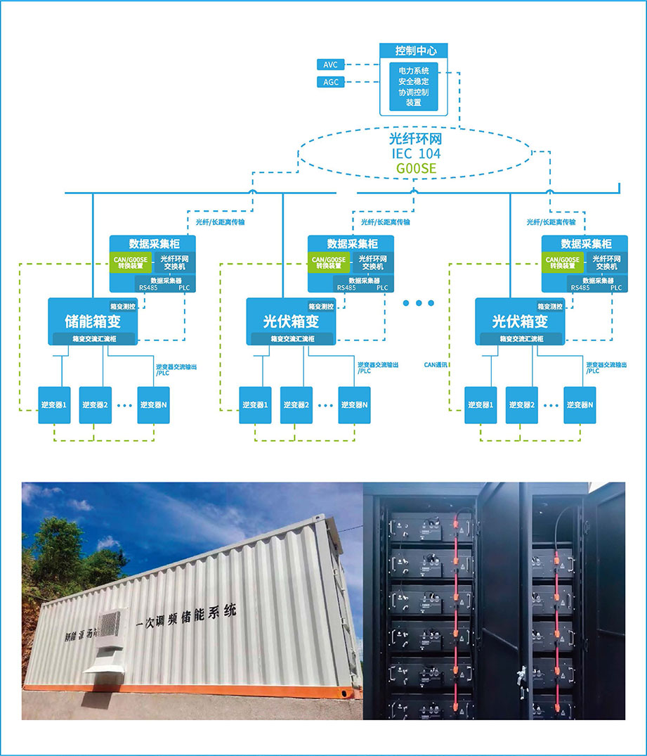 利用該系統(tǒng),單機(jī)或加裝獨(dú)立控制裝置,新能源發(fā)電廠可完成有功-頻率下垂特性控制,使其在并網(wǎng)點(diǎn)具備參與電網(wǎng)一次調(diào)頻響應(yīng)能力??砂凑招履茉唇涣鱾?cè)額定功率的10%~20%,儲能時(shí)長按照1h~2h進(jìn)行配置。本系統(tǒng)可控制分布式無功輸出,能滿足在30ms對AVC/AGC調(diào)度指令的響應(yīng),替代集中式的SVG設(shè)備。